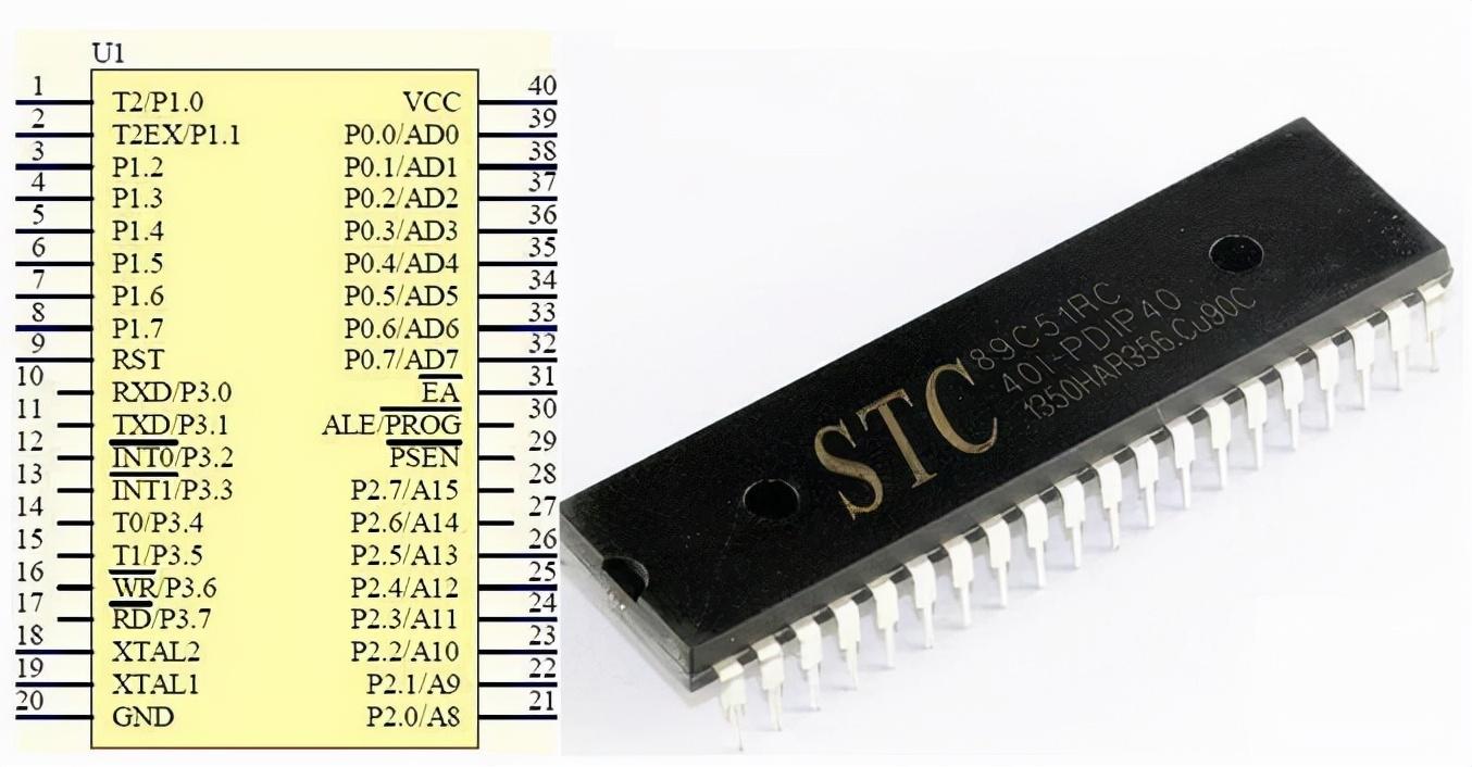 电源及时钟引脚:Vcc(40脚)、GND(20脚)、XTAL1(19脚)、XTAL2(18脚)。