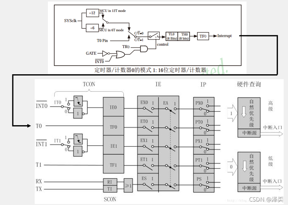 Ⅰ: TF0中断溢出标志位,TF0 = 0 被允许计数以后,从处置开始计数+1,当最高位产生溢出的时候,由n硬件置"1"TF0 = 1的时候就会向CPU请求中断。