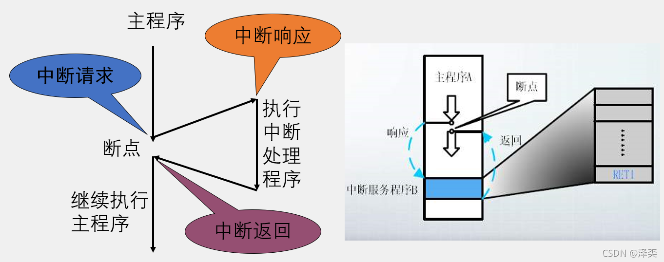 器溢出,中断请求 --> 跳转到中断的一个函数里面执行中断里面的任务 --> 中断执行完之后再返回原来断点的地方就是原来从哪里停的现在从哪里回来 --> 然后再继续执行主函数。