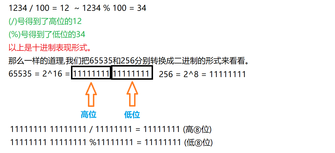 TH0 = 64535/256;把高8位拿出来了,TL0=64535%256;低8位拿出来了。这个可能理解起来会比较难点,但是其实这样就很好理解了,用画图的方法来演示下吧
