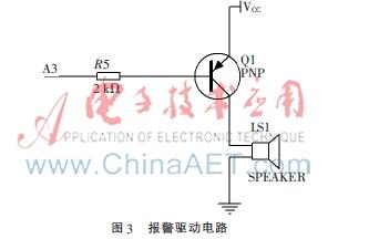 蜂鸣器是一种一体化结构的电子讯响器,采用直流电压供电,广泛应用于各种电子产品中作为发声器件。而在单片机应用的设计上,大部分都会使用蜂鸣器来作提示或报警,为此本设计中也采用蜂鸣器作为报警提示。蜂鸣器驱动电路一般都包含以下几个部分:一个三极管、一个蜂鸣器、一个续流二极管和一个电源滤波电容。本设计采用如图3所示的电路驱动蜂鸣器,R5阻值为2 kΩ,蜂鸣器驱动电路与单片机的P3.3口连接;蜂鸣器的额电流小于等于30 mA,对于AT89S51单片机来说,P3.3口的灌电流是15 mA,很明显可以看出仅仅依靠P3.3口的电流是驱动不了该蜂鸣器的,这就需要使用晶体管放大电路,所以本设计选用PNP型晶体管。