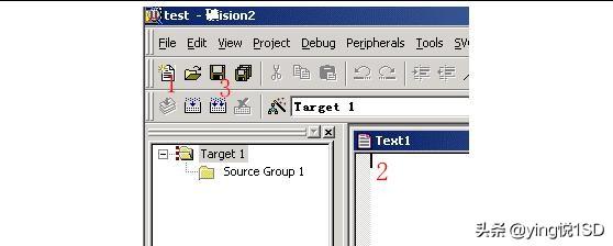 (3)首先我们要在项目中创建新的程序文件或加入旧程序文件。如果您没有现成的程序,那么就要新建一个程序文件。在 KEIL 中有一些程序的 Demo,在这里我们还是以一个 C 程序为例介绍如何新建一个 C 程序和如何加到您的第一个项目中吧。点击图 1-5 中 1 的新建文件的快捷按钮,在 2 中出现一个新的文字编辑窗口,这个操作也可以通过菜单 File -New 或快捷键 Ctrl+N 来实现。好了,现在可以编写程序了,光标已出现在文本编辑窗口中,等待我们的输入了。第一程序嘛,写个简单明了的吧。下面是经典的一段程序,呵,如单片机 C 语言入门教程