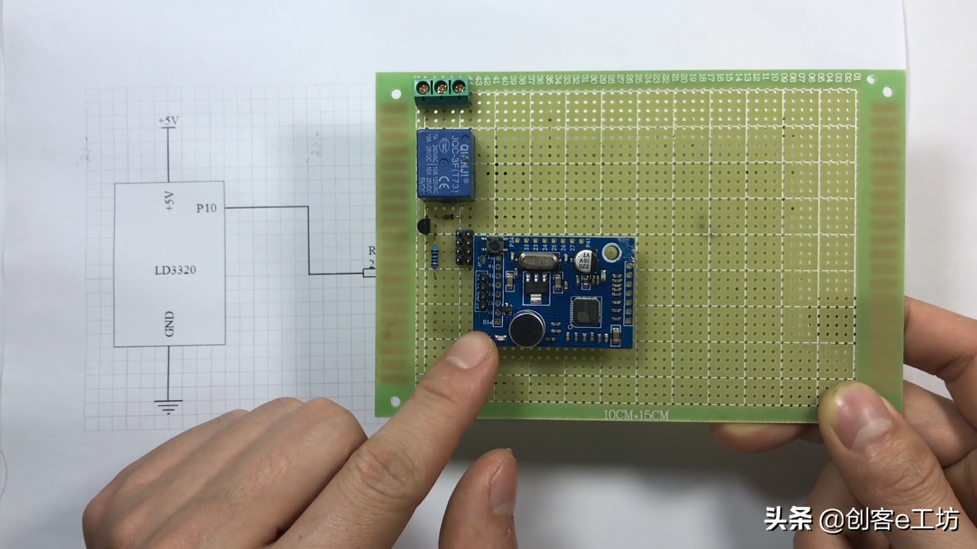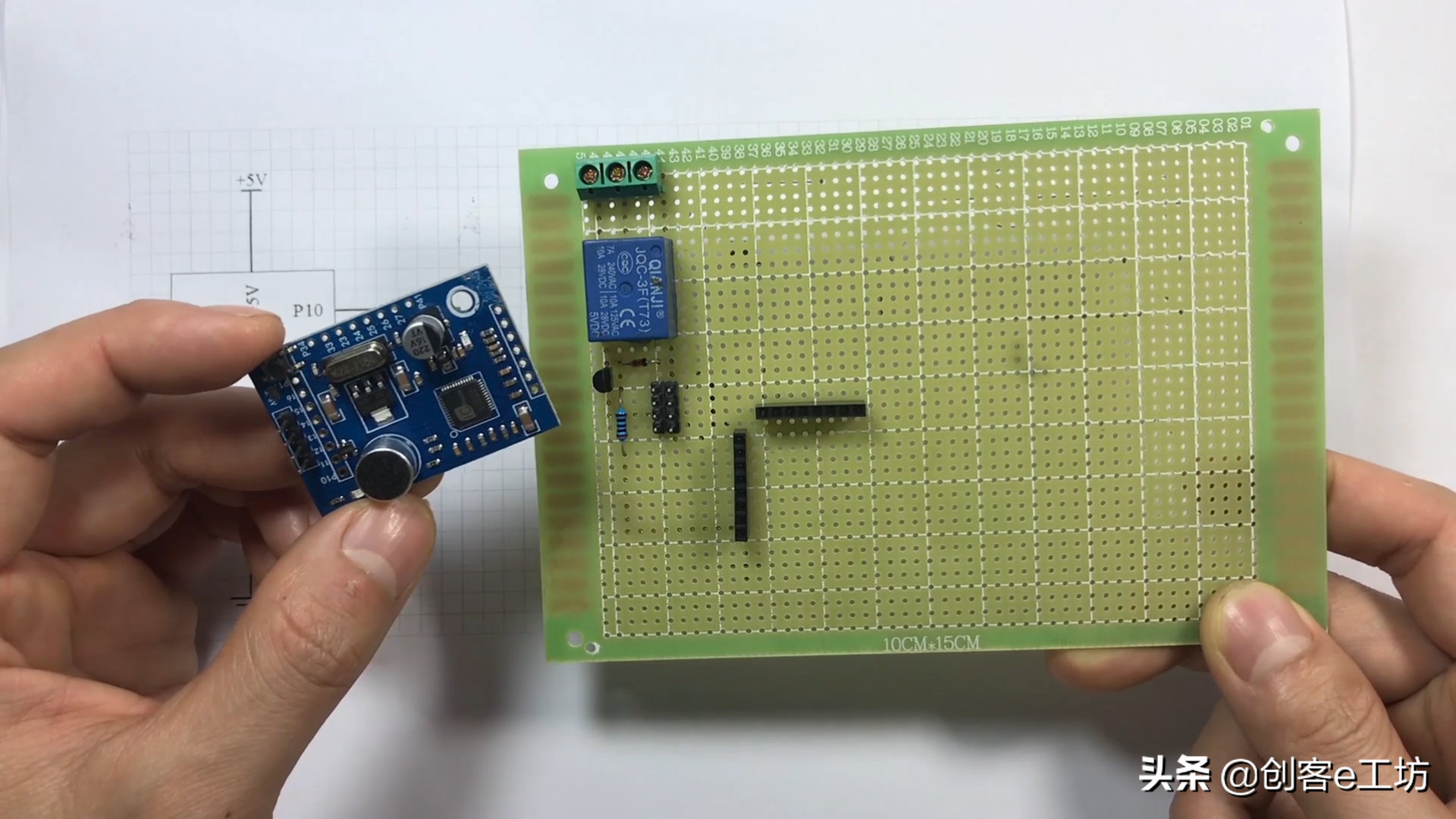 如下图是我根据这个电路图焊好的继电器模块,顺便给这个语音识别模块做了个底座,只要把语音识别模块安到底座上,就可以通过底座给语音模块供电,也把P10口和继电器电路的控制端口接在一起了。