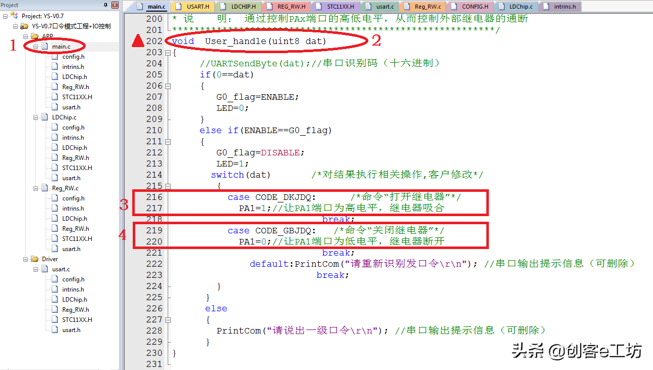 好,最后们要修改处理函数,就是说当模块识别到我们的命令了,需要做什么,是从哪个IO口输出高电平还是低电平,这就是在处理函数这里实现了。如下图,在左边工程栏(图中红色圈圈1)找到并双击打开main.c函数,然后下滑找到 202行“void User_handle(uint8 dat)”这个函数(图中红色圈圈2),在这个函数中可以根据自己的使用情况在相对应的识别码后添加识别成功后的操作。