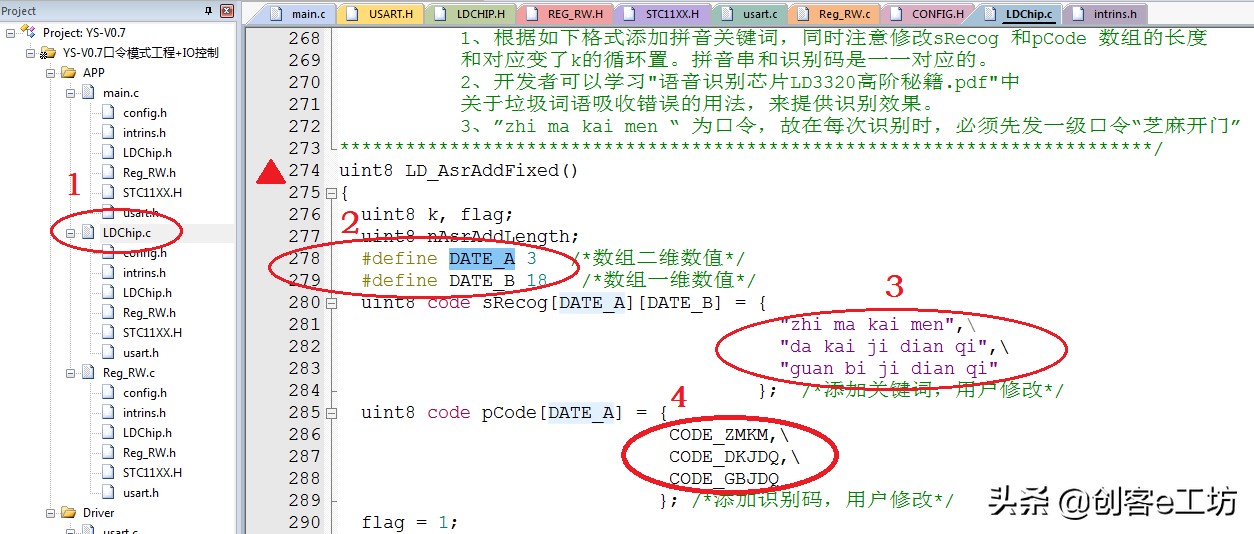 在 LDChip.C (下图中红色圈圈1)文件中下滑找到274行“uint8 LD_AsrAddFixed() ”这个函数,函数中,278,279这两行有两个数组,DATE_A 和DATE_B,后面跟着数字,这个DATE_A后面的数字表示的是关键词的个数,而DATE_B后面的数字表示的是这些关键词中最长一句的长度。我们将要添加三个关键词命令:“芝麻开门”,“打开继电器”,“关闭继电器”,所以DATE_A 后面跟着个3;而这三个命令的拼音中,包含空格,长度最长的是“guan bi ji dian qi”,有18个,所以DATE_B后面跟着18,如图中的红色圈圈2。