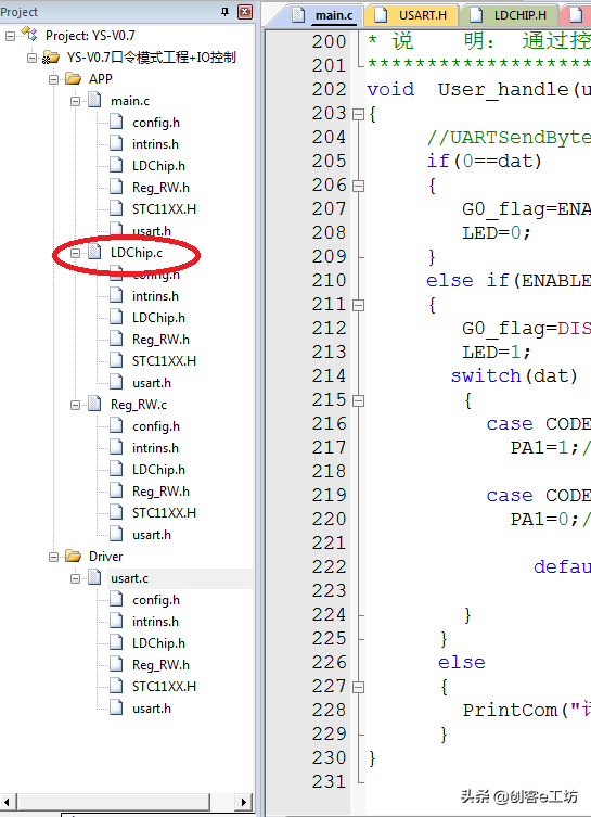 如下图,在左边工程栏里找到“LDChip.C”这个文件,双击打开: