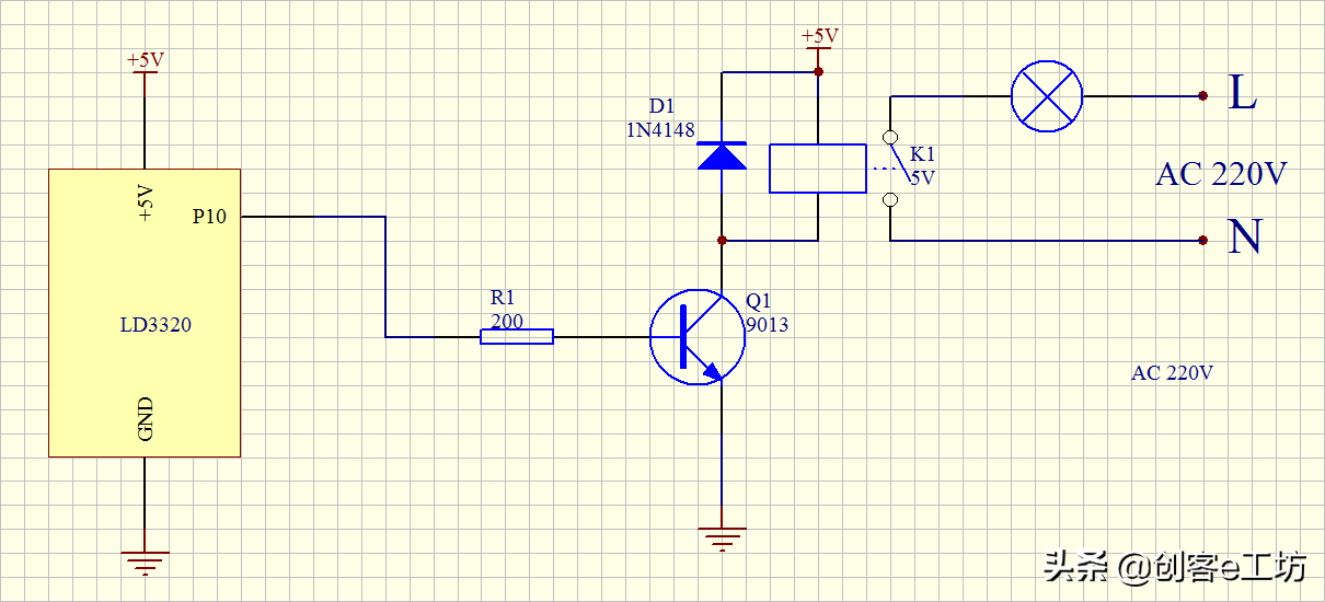 电路中,语音识别模块的P10引脚出来直接接一个200Ω的电阻,电阻的另一头接到9013NPN三极管的基极,9013三极管发射极接地,接电源负极,集电极接1N4148二极管的正极和继电器的一个控制引脚,继电器的另一个控制引脚接到+5V电源。这样子当P10端口输出高电平时,三极管导通,继电器吸合;当P10端口输出低电平时,三极管截止,继电器断开。我们就可以通过继电器去控制各种家电了。在电路图中,我是让继电器控制一盏220V的灯。电路图中1N4148二极管和继电器并接,而且是将二极管的负极接到电源正极,二极管在这里起到续流的作用,可以保护三极管。