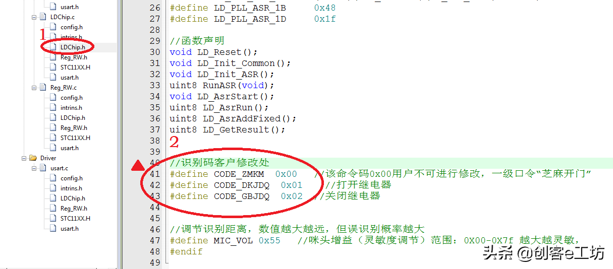 好,接下来去定义识别码,这些东西我们要先定义才能使用,如下图,在左边工程栏(图中红色圈圈1)找到并双击打开LDChip.h 这个文件,下滑找到第40行,看到#define这一堆这里(图中红色圈圈2),这里就是添加和修改识别码的地方,我们可以根据自己的需要和喜好任意定义识别码和宏名,但必须和刚才前面所使用的识别码配对,否则会提示未定义错误。识别码后面的数字字母不用理它,如果增加识别的关键词的个数,按顺序往下增大就可以,如“0x03,0x04”等。