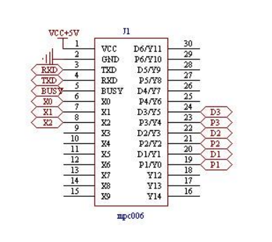 mpc006 运动控制芯片模块采用 5V 电源供电,RXD,TXD,BUSY 与单片机连接。X0,X1,X2 可作为三路电机的原点信号,P1,D1 为 1 轴的脉冲和方向信号。P2,D2 为 2 轴的脉冲和方向信号。P3,D3 为 3轴的脉冲和方向信号。