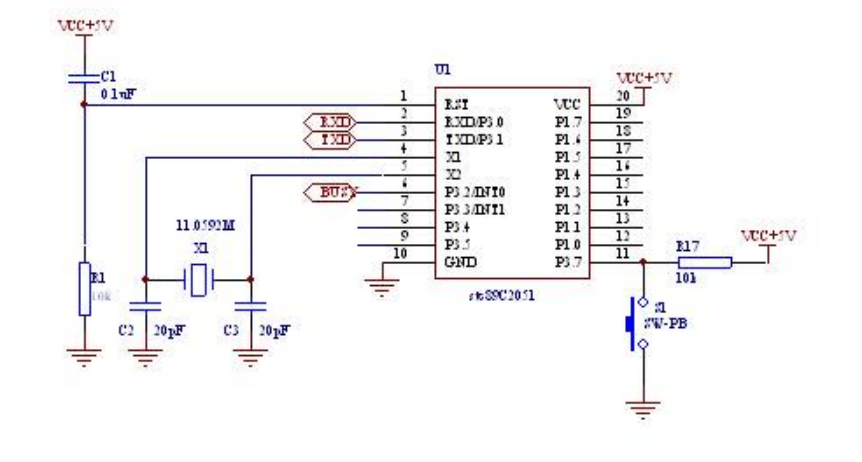 单片机与模块只需三根线连接,用作串口通讯的 RXD 和 TXD,用作模块缓存满输出的 BUSY 信号。P3.7引出一按键作为测试使用。