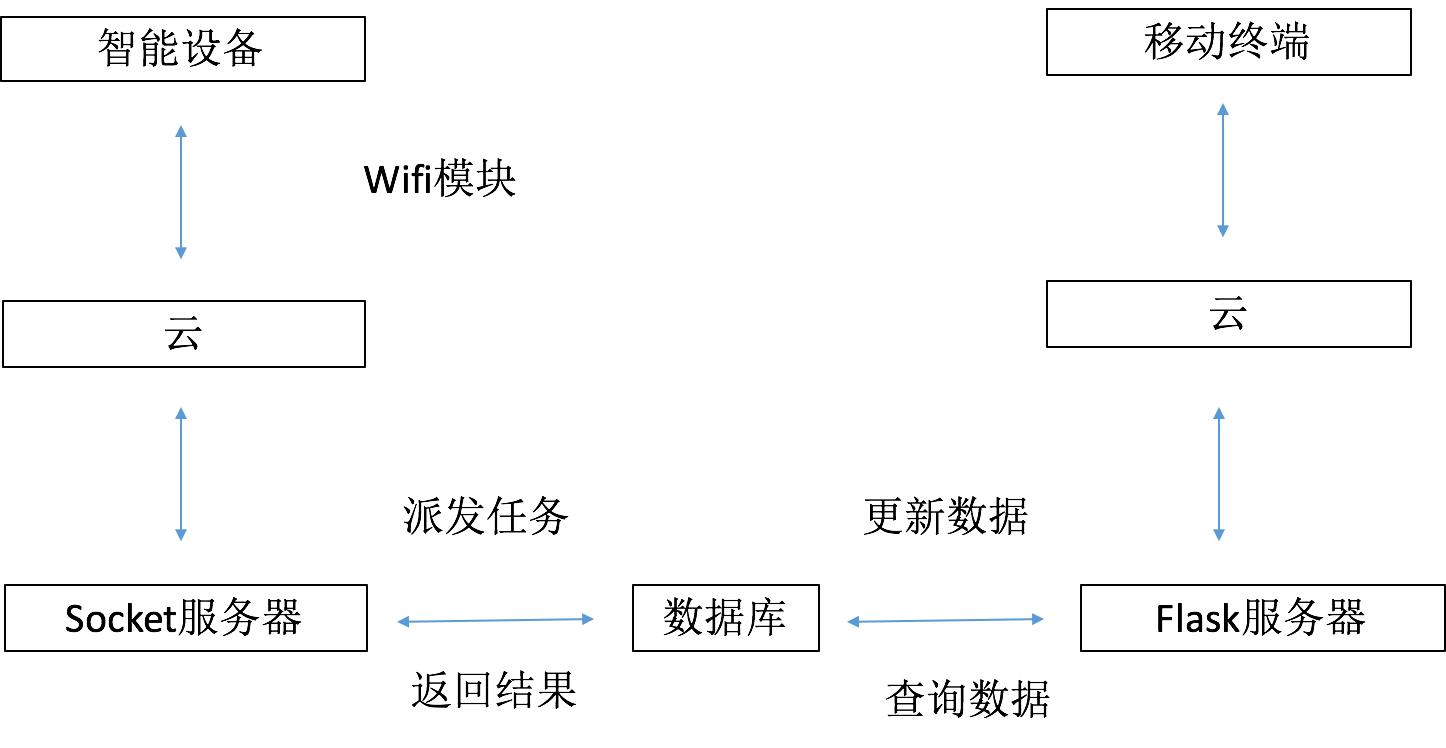 Android手机终端和智能设备通过不同的服务器进行通信 ,Android手机终端采用http 协议与服务器进行通信,服务器提供了用于通信的RESTful API,嵌入式智能设备基于 Socket与服务器连通。两个服务器部署在同一台机器上,通过MYSQL数据库做中间桥接,实现数据的共享。