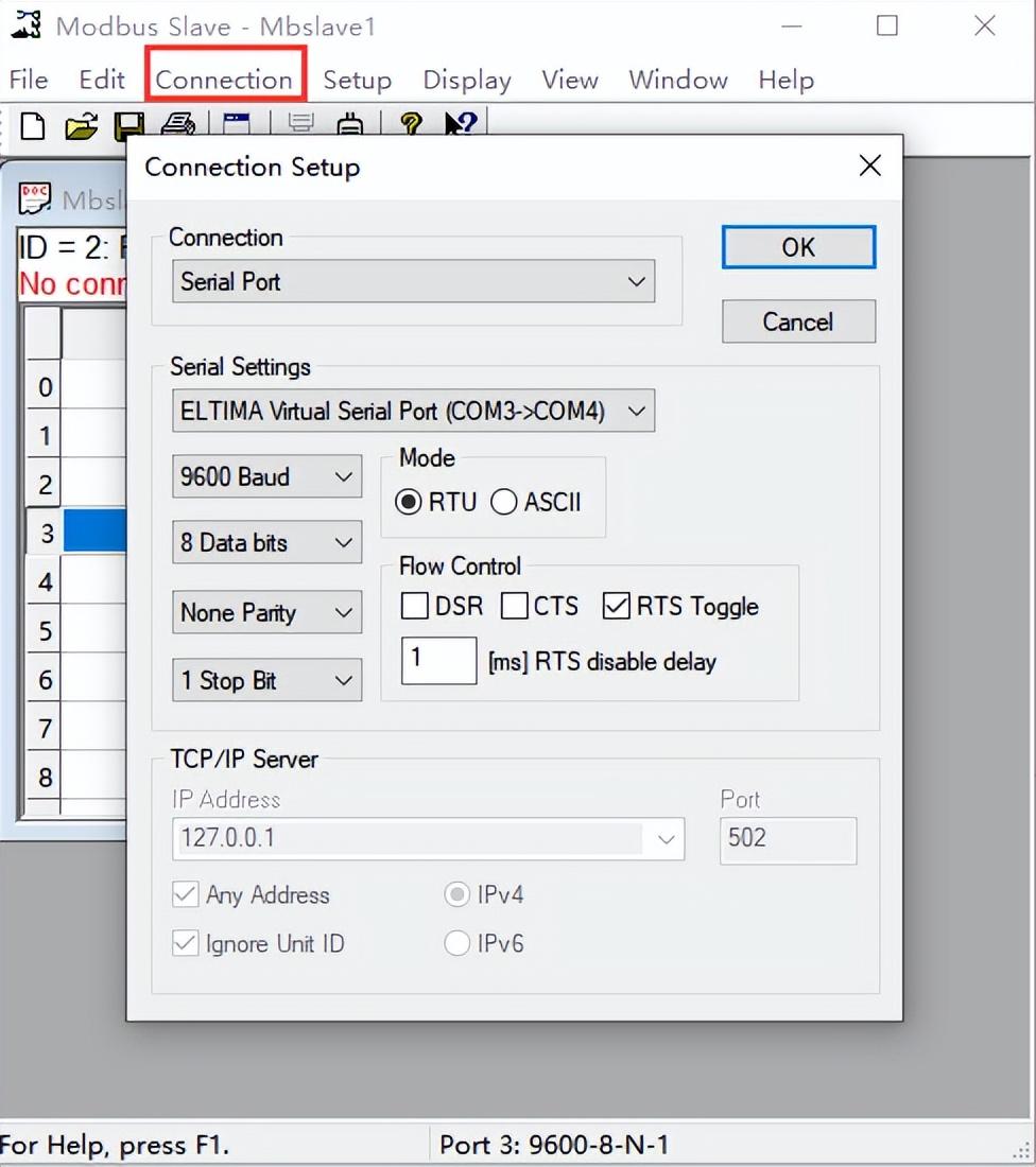通讯端口选择COM4,Modbus协议设备选择COM3,站号选择2.