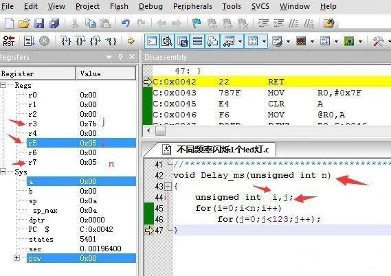 上图所示的程序是51单片机毫秒延时函数,局部变量j、i在RAM中的r3和r5寄存器中,入参n在r7寄存器中,R0-R7寄存器组在RAM中,其实左边调试栏中的寄存器均在RAM中运行。总之,RAM是运行数据的地方,而代码(指令)则是存放在ROM区的。