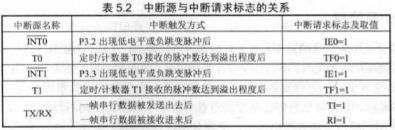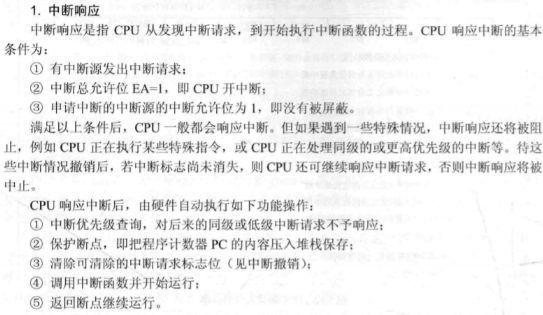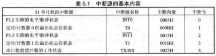 5个中断源;中断标志在TCON寄存器中设定的对应的触发条件达成时由硬件置位;除串口中断外,进入处理函数前由硬件撤销中断标志;串口中断标志由软件清除;中断向量分别为:0003;000B;0013;001B;0023;