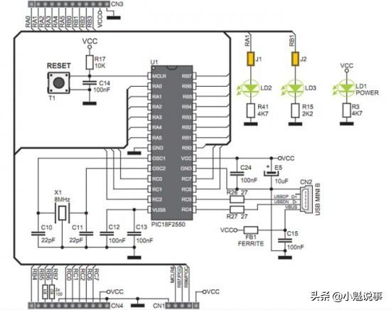 用于USB的PIC板的StartUSB电路图,其中两个LED连接到RA1和RB1