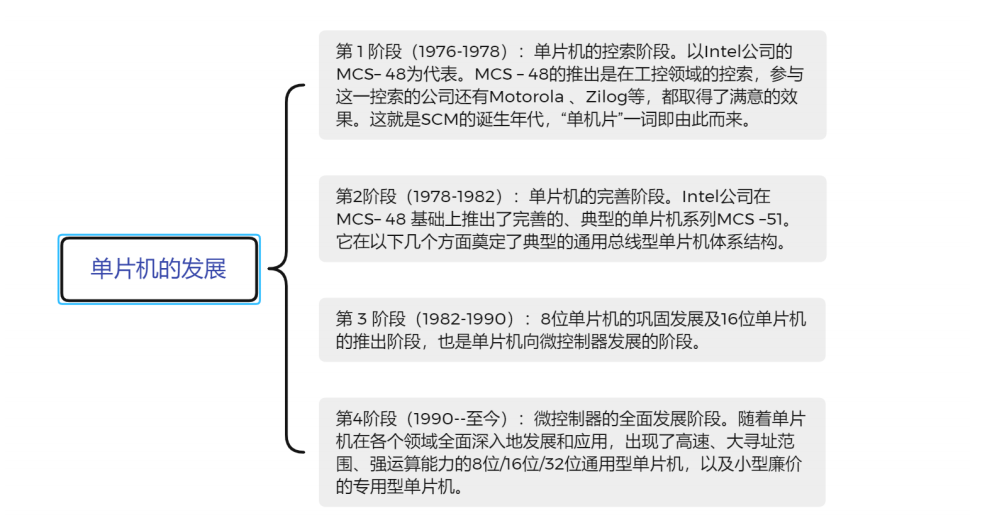 早期的单片机都是8位或者4位。其中最成功的是INTEL的8031,因为简单可靠二性能不错获得了很高的好评。后来格局8031发展而来的MCS51系列单片机被广泛使用,随着工业控制领域要求的提高,8位单片机的性能已经不够用,开始出现16位的单片机,但由于性价比原因没有被广泛使用。后来ARM系列单片机异军突起,带来了32位单片机,在性能和价格方面都碾压之前的单片机,获得了广泛的应用。