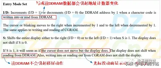 这段说明中还提到了I/D 位(Increment/Decrement)与S 位(Shift),这就要涉及到另一条“进入模式设置(Entry mode set) ”,如下图所示。