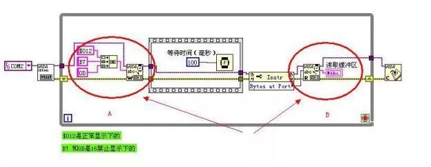 下面,我们把上图的例子部分,用 LabVIEW 写一下。注意:命令串:$012B7(cr)中$012 是 ASCII 显示下的,而 B7 是十六进制显示下的。cr是回车符,即 16 进制的 OD。
