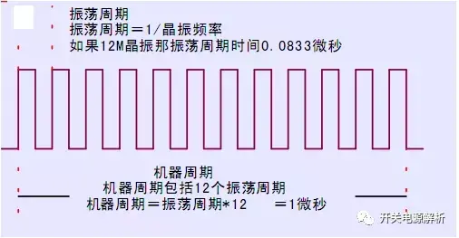 单片机在每访问一次存储器的时间成为一个机器周期,机器周期是一个时间基准,就像我们生活中的秒一样,单片机一个机器周期包括12个振荡周期,振荡周期就是振荡源一个高低电平的转换时间,如果我们用12MHz的晶振,那么振荡周期为(T=1/F),也就1/12微妙,那我们用的是12MHz的晶振,一个机器周期就等于12*1/12=1微妙。