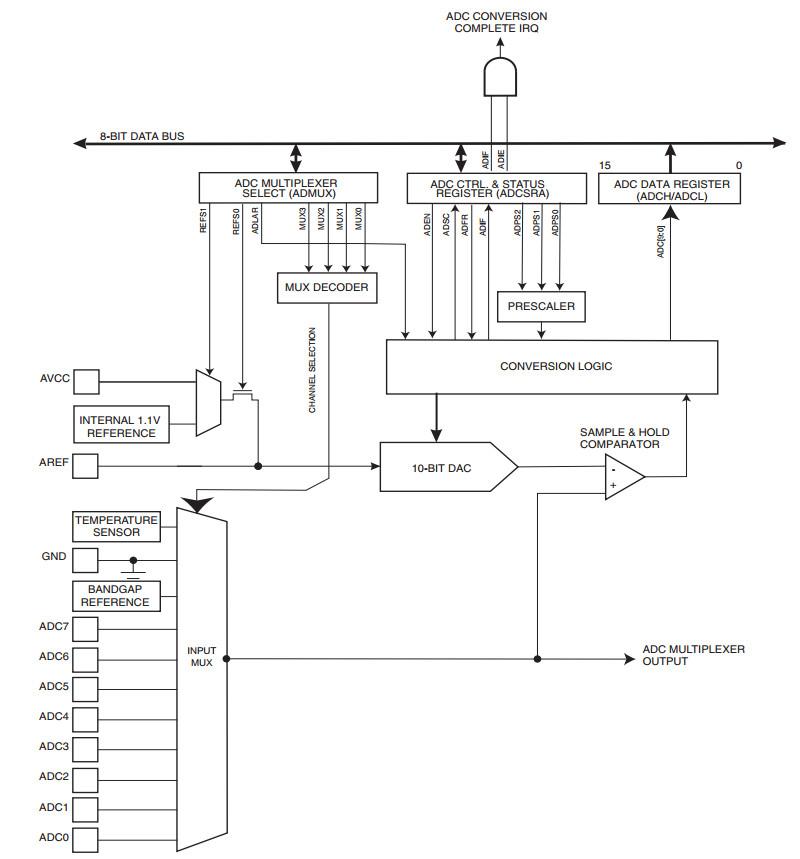 ATmega328p内部集成了一个10位的逐次逼近的A/D转换器。该转换器与一个8通道的模拟多路复用器连接。它能够对来自端口A的8路单端输入电压进行采样。