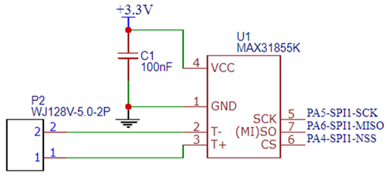 其中P2是热电偶的接线端子,接入MAX31855的2、3脚。芯片的1、4脚之间需要接入0.1uF的去耦电容,在上面的MAX31855K模块实物图中也能看到这样的设计。5脚连接单片机的SPI-CLK脚,6脚是芯片的片选引脚。在与单片机的通信过程中,MAX31855作为SPI从设备以只读模式发送数据至单片机,因此芯片的7脚MISO(主设备输入,从设备输出脚)要连接单片机的SPI-MISO脚。