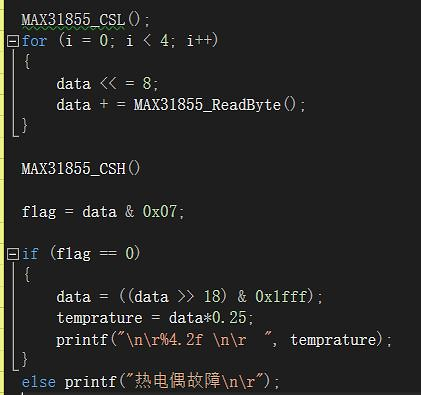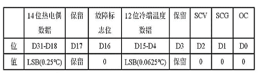 所读取的32位数据中包括14位的热电偶测量端温度数据和12位的冷端温度数据。后三位是故障类型标志位,分别为SCV(对VCC短路)、SCG(对地短路)、OC(热电偶开路),当发生以上三种故障时对应的故障类型标志位和D16位都会被置一。