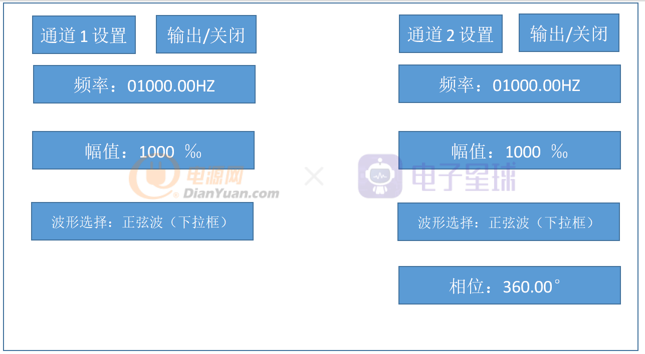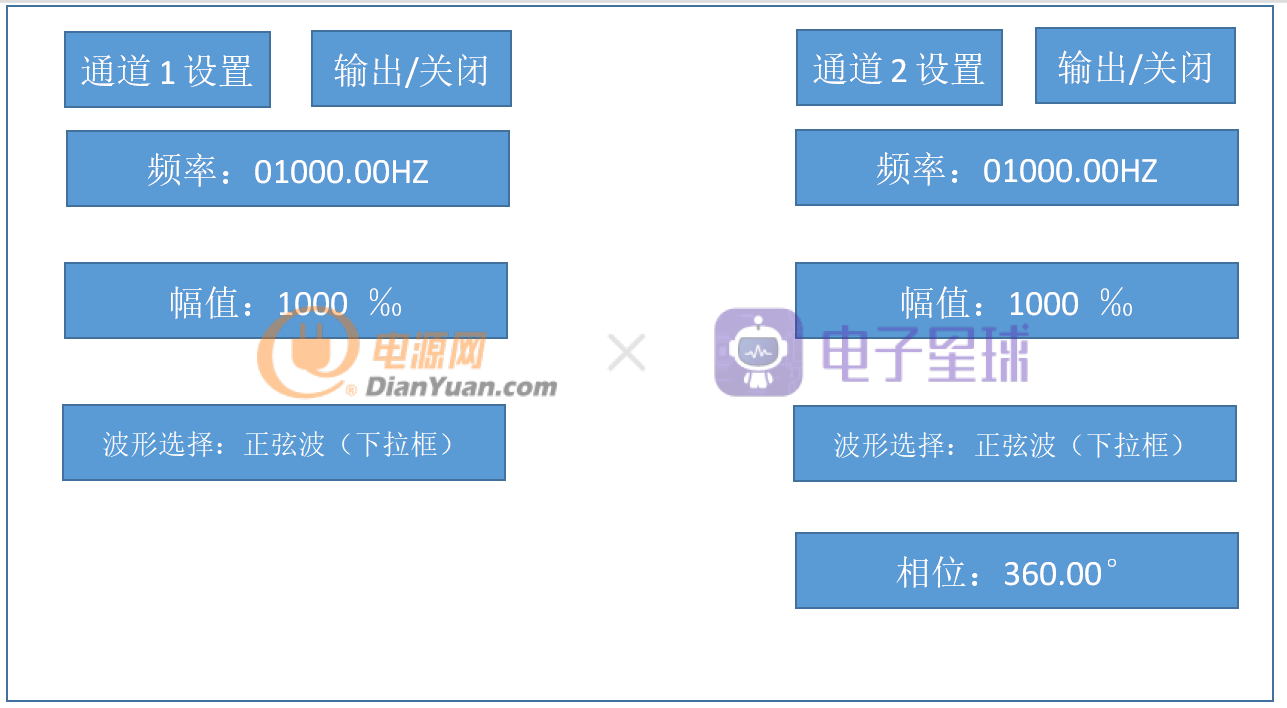 ·相位0-360°可调,最小步进0.01°,相位调节只在两路波形频率相同时生效;
