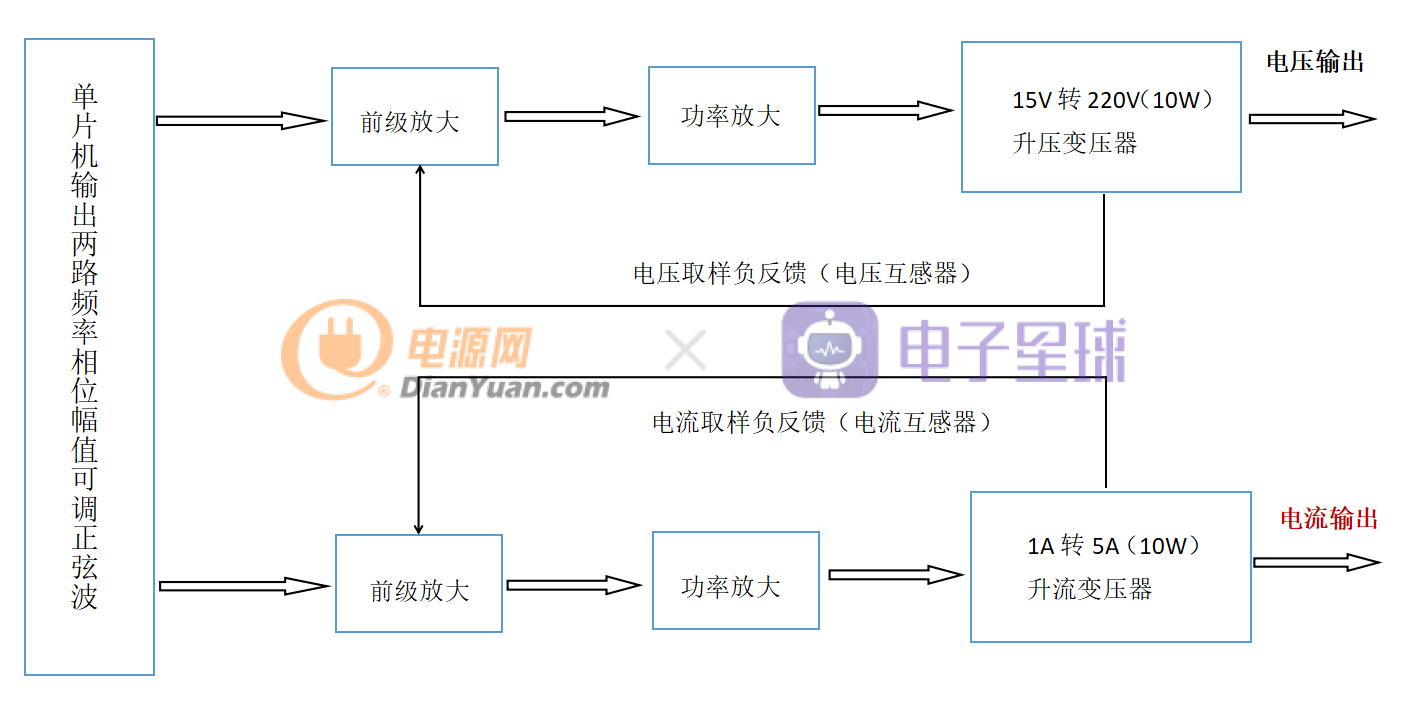 我们给出的方案就是用单片机产生两路频率、相位、幅值可调的正弦波信号。将正弦波信号分别送给两个功放模块然后经过变压器升压或升流。变压器有内阻,所以升压升流后的电压电流会随负载的增大而减小。此时通过电压、电流互感器采样后反馈给功放模块的前级运放做负反馈,调节负反馈的深度从而达到负载变化输出端稳定的状态。