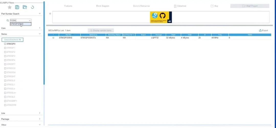 我们首先打开CubeMX,然后输入芯片的型号STM32F030K6T6,可以看到封装LQFP32,然后32K的flash,4K的RAM,25个IO口,最高工作频率可以达到48兆。