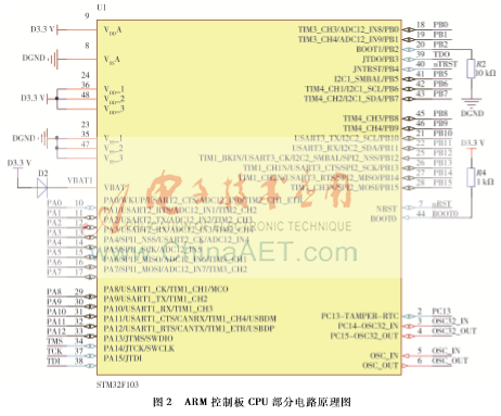 机械手的控制核心采用功能强大的ARM芯片来进行设计,芯片型号为STM32F103C8T6,引脚数48。控制板接收上位机的串口通信数据,并根据数据协议转变为控制步进电机的脉冲信号去驱动各个步进电机,控制板采用双排针将所有GPIO全部引出,可以灵活扩展[5]。原理图使用的是Altium Designed 10软件进行绘制,ARM控制板CPU部分电路原理图如图2所示,时钟、复位、电源电路原理图如图3所示,串口与JTAG电路原理图如图4所示[67]。
