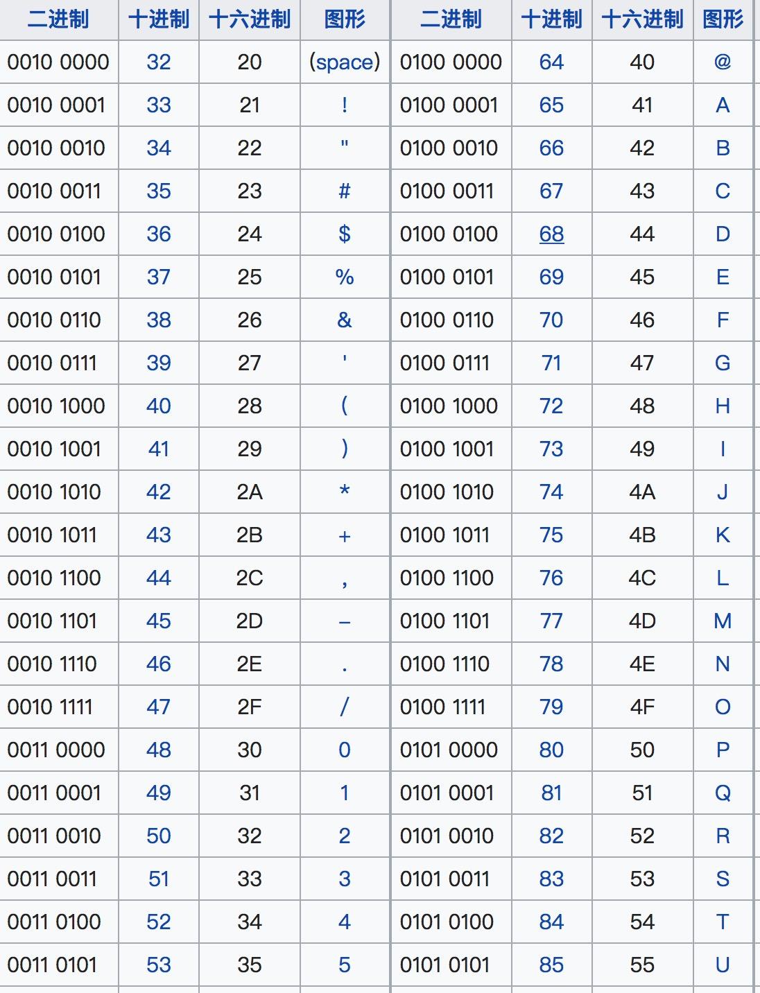 ASCII表如下图所示,每一个图形都对应的8位的二进制,比如A对应的是0100 0001,如果我们要给电脑发送A的话,是不是发送0100 0001对应的高低电平就可以了(1对应高电平)?