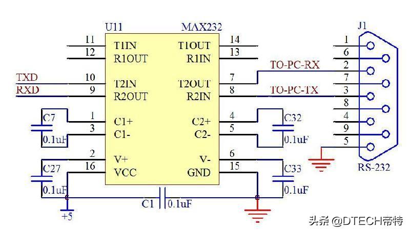 通信使用3根线完成:(1)地线,(2)发送,(3)接收。
