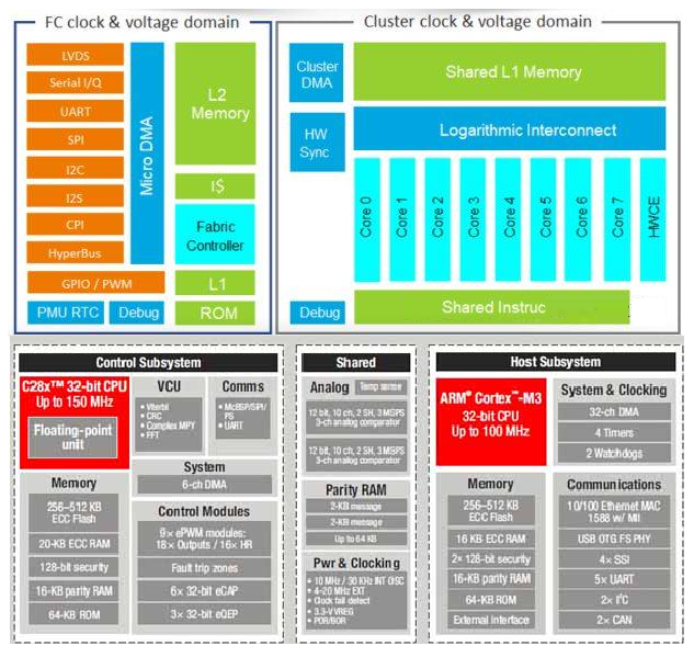 与独立的双芯片相比,多核单片机架构有很多优点。再添加一个内核的代价远比添加一个独立的单片机要低,尤其是当两个内核架构相似时。另一方面,多个内核可以有相同的主频,并且可以通过总线矩阵平等地访问片上资源。