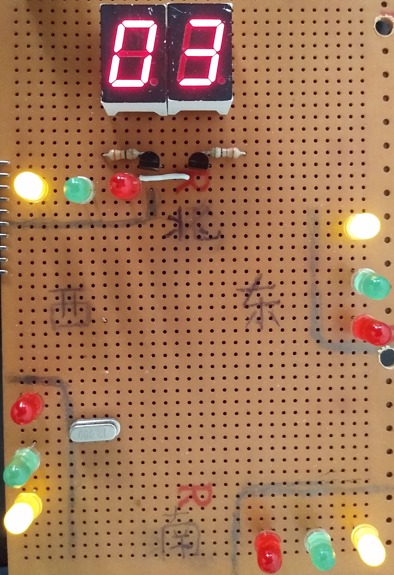 在生活中十字路口经常会见到交通信号灯,很多朋友都习以为常,初学电子或单片机的小伙伴们想知道如何动手实现这样的电路吗?今天我利用单片机基础知识手把手教大家如何实现一个模拟交通灯的电路。而现实中的交通灯都是用大功率器件来驱动的,例如到功率三极管或晶闸管等。那其控制电路也必须要单片机芯片,我们讲的是比较典型的一种国产芯片,STC宏晶公司出产的,其改进信号的运行速度是普通C51的十多倍,如果想学高端的单片机芯片,比如STM32、ARM、甚至DSP等高端单片机芯片,我认为先学好C51在学高端的,这样学习循序渐进,不会打消自己的学习积极性,便于建立自己学好单片机的信心。好了。我们言归正传,下面我们说说设计要求,我们是用万能PCB板由C51单片机焊接组成单片机最小应用系统,控制南北和东西两条干线十字路口的交通信号灯量灭,同时用两位共阳极的数码管进行倒计时。使两条干线交替成为放行线和禁止线。刚上电的时候东西绿色灯亮40 秒,然后红色灯亮30秒,黄灯亮3秒;南北绿色灯亮30 秒,然后红色灯亮40秒,黄灯亮3秒。执行一周期然后如此循环。