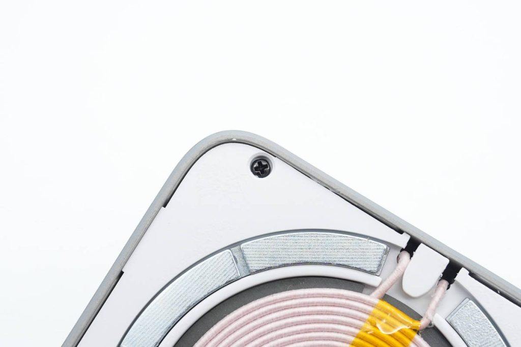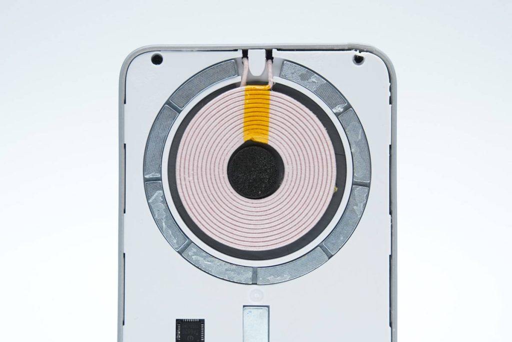 撕下表面粘贴的装饰面板,在面板下面是无线充电线圈,用于吸附手机的磁铁环和定位磁铁。
