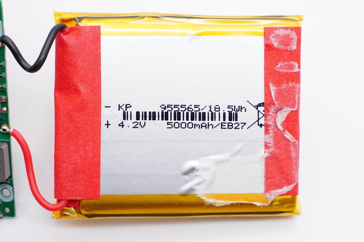 电芯两端包裹红色绝缘纸,规格为5000mAh/18.5Wh/4.2V。