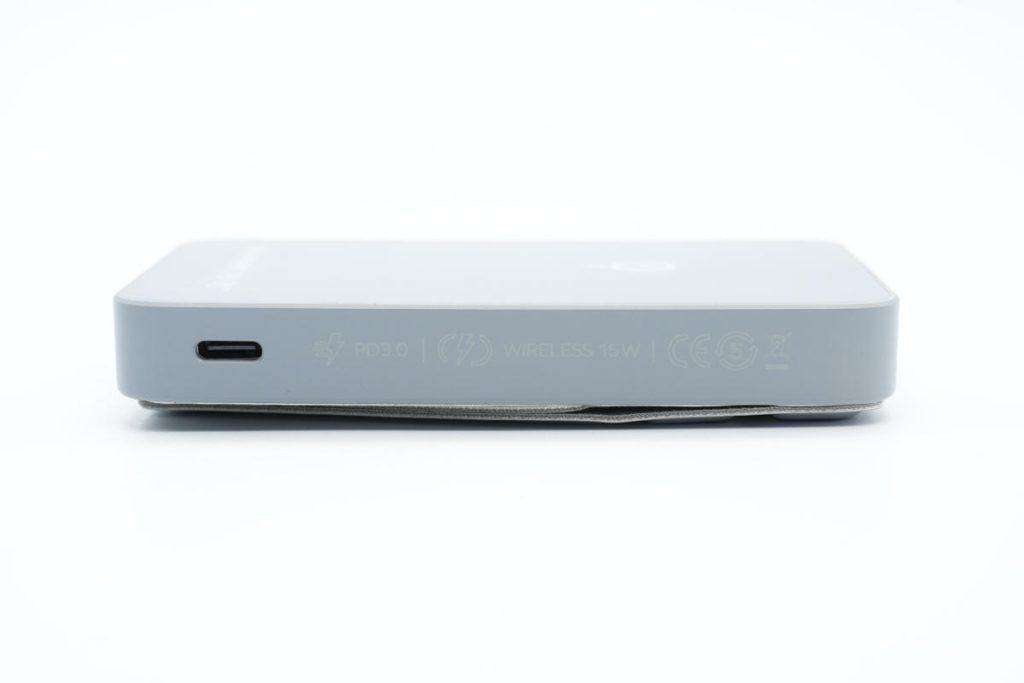 这款磁吸无线充移动电源灰色配色,外壳采用PC防火材质,表面磨砂抗指纹。