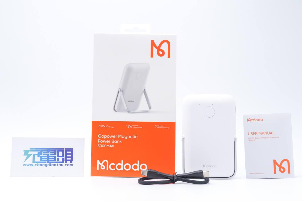 包装盒正面印有Mcdodo麦多多品牌、产品外观图、名称,以及5000mAh、20W PD快充、15W无线充等卖点。