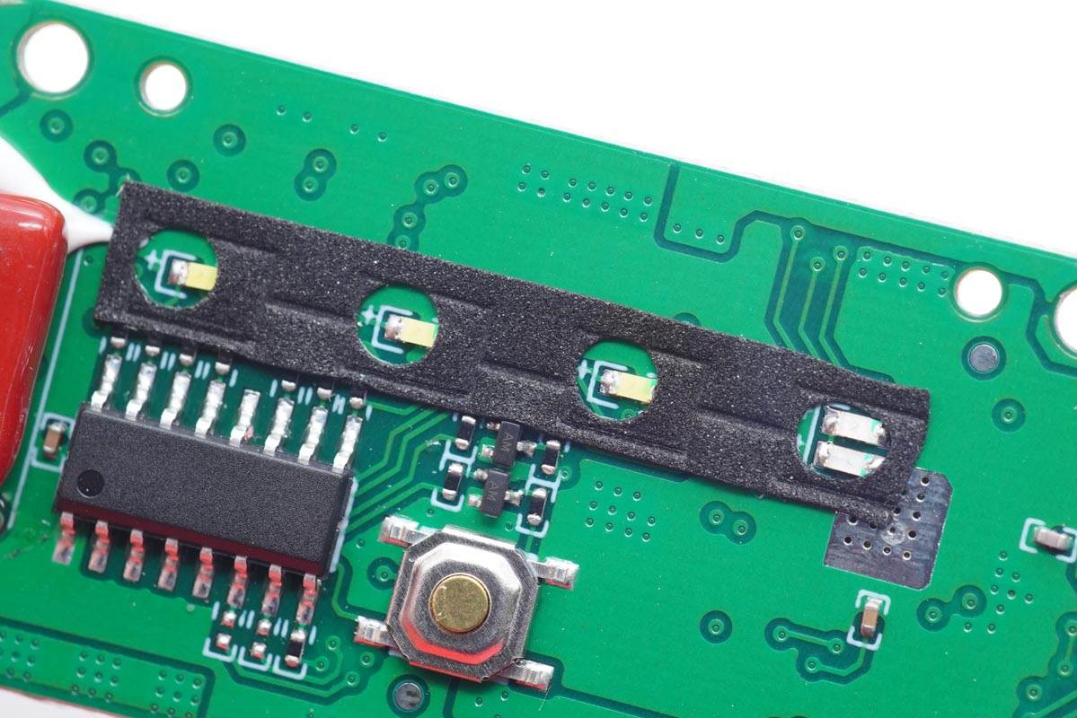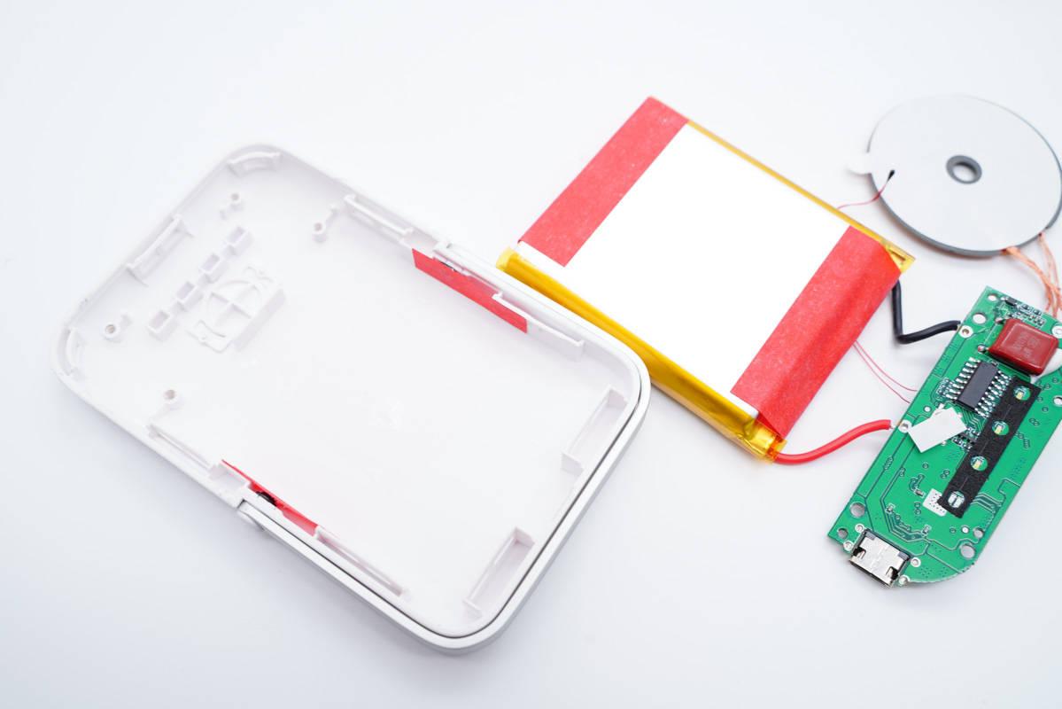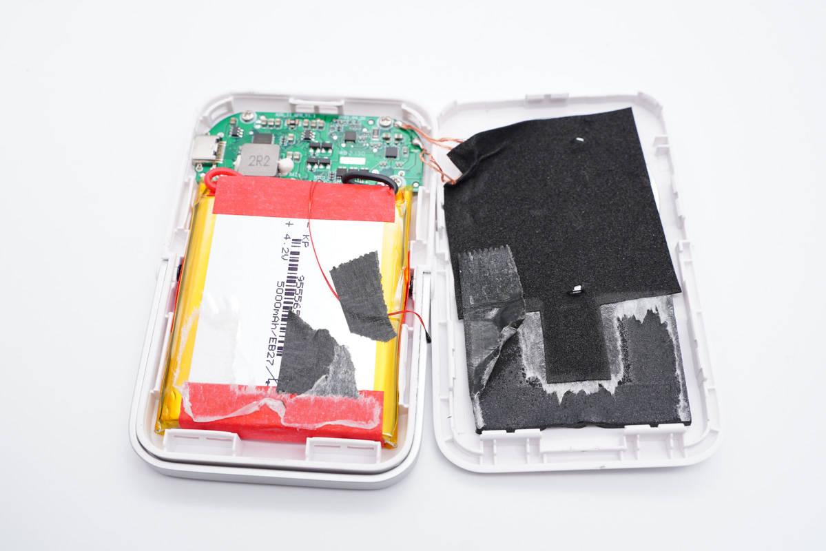 将机身壳拆开,卡扣固定封装,外壳上贴有缓冲泡棉保护电芯。