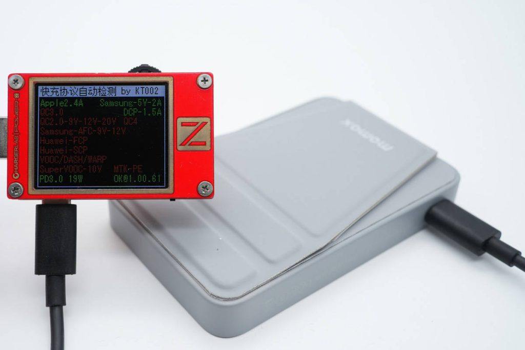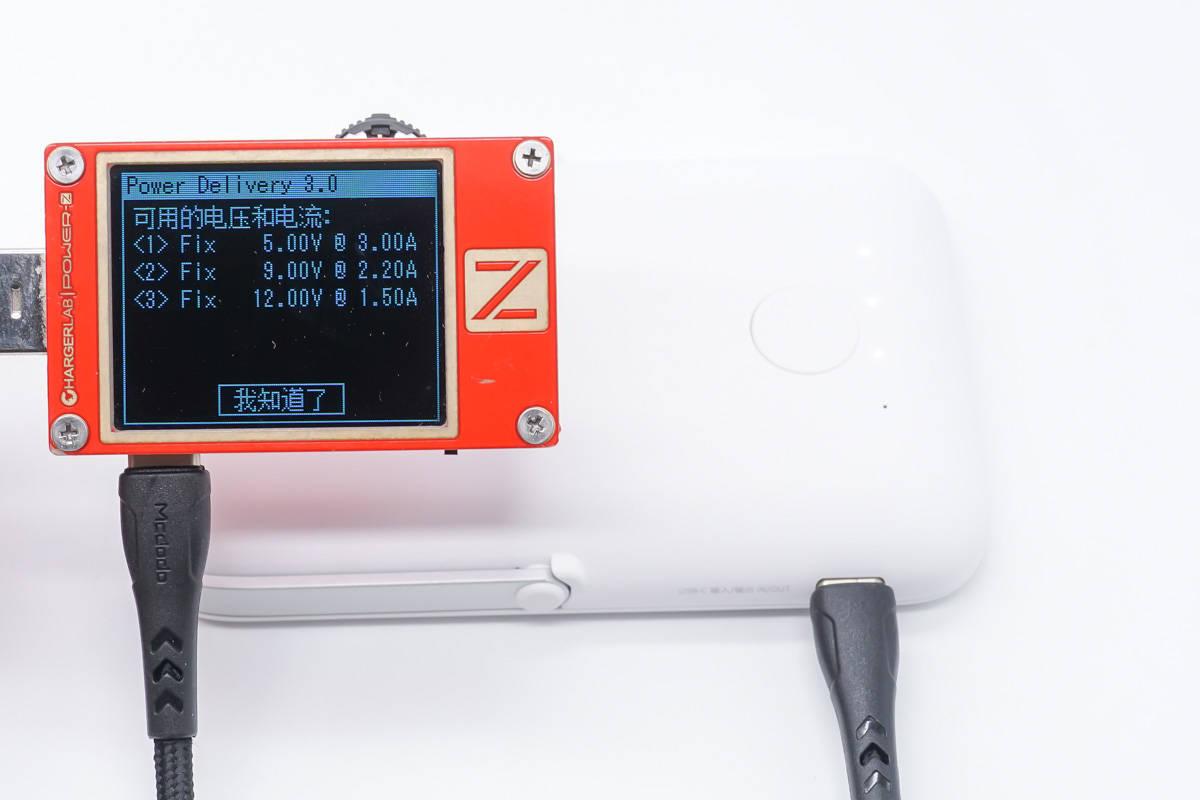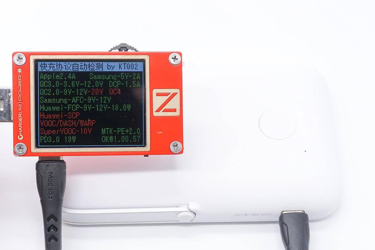使用ChargerLAB POWER-Z KT002测得USB-C口支持Apple2.4A、Samsung 5V2A、DCP协议,以及PD3.0快充协议。