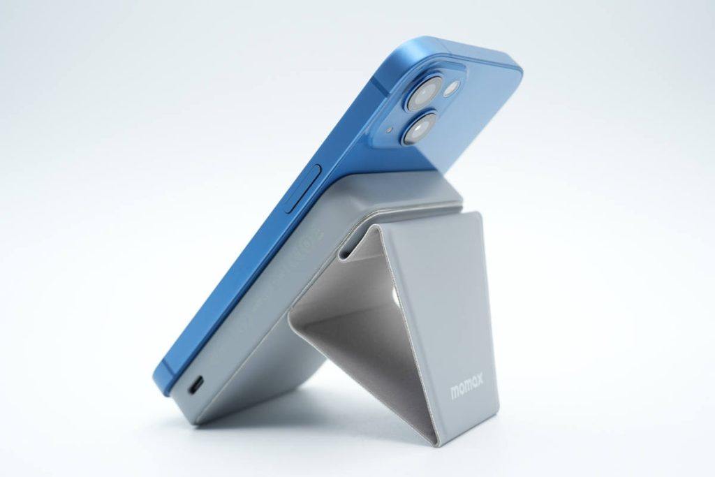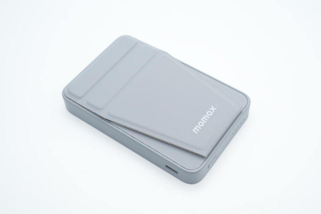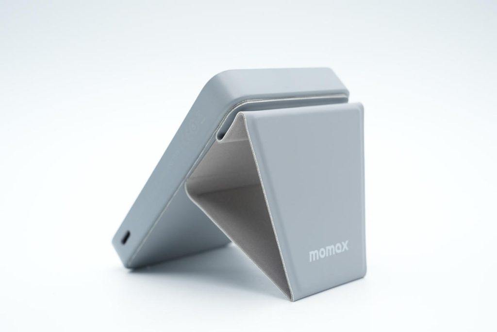 背面设有可折叠式皮质支架,并印有MOMAX品牌。