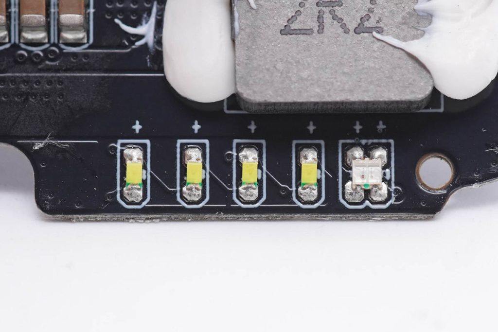 电源指示灯和状态指示灯特写,指示移动电源的快充状态及电池电量。