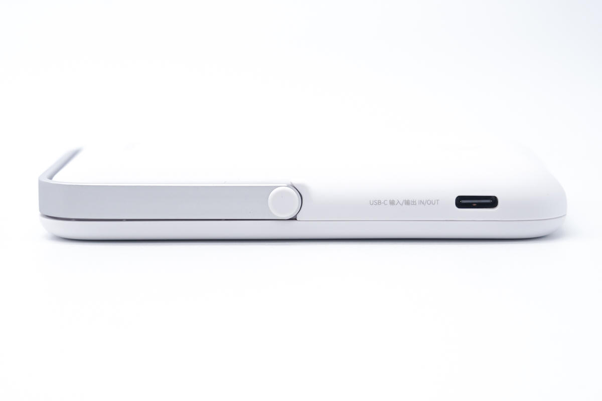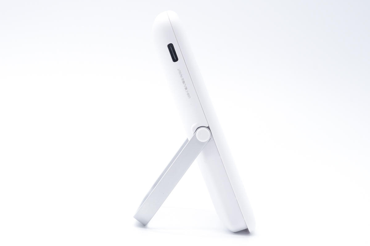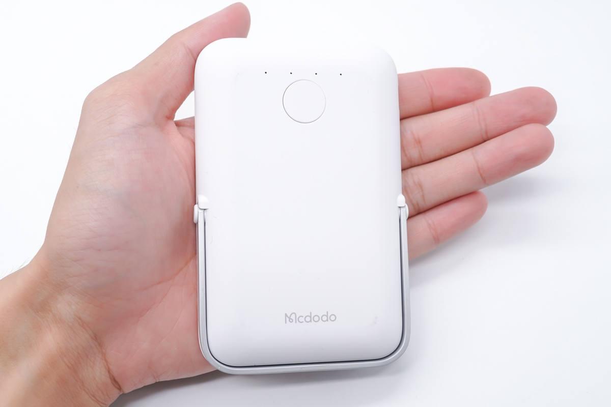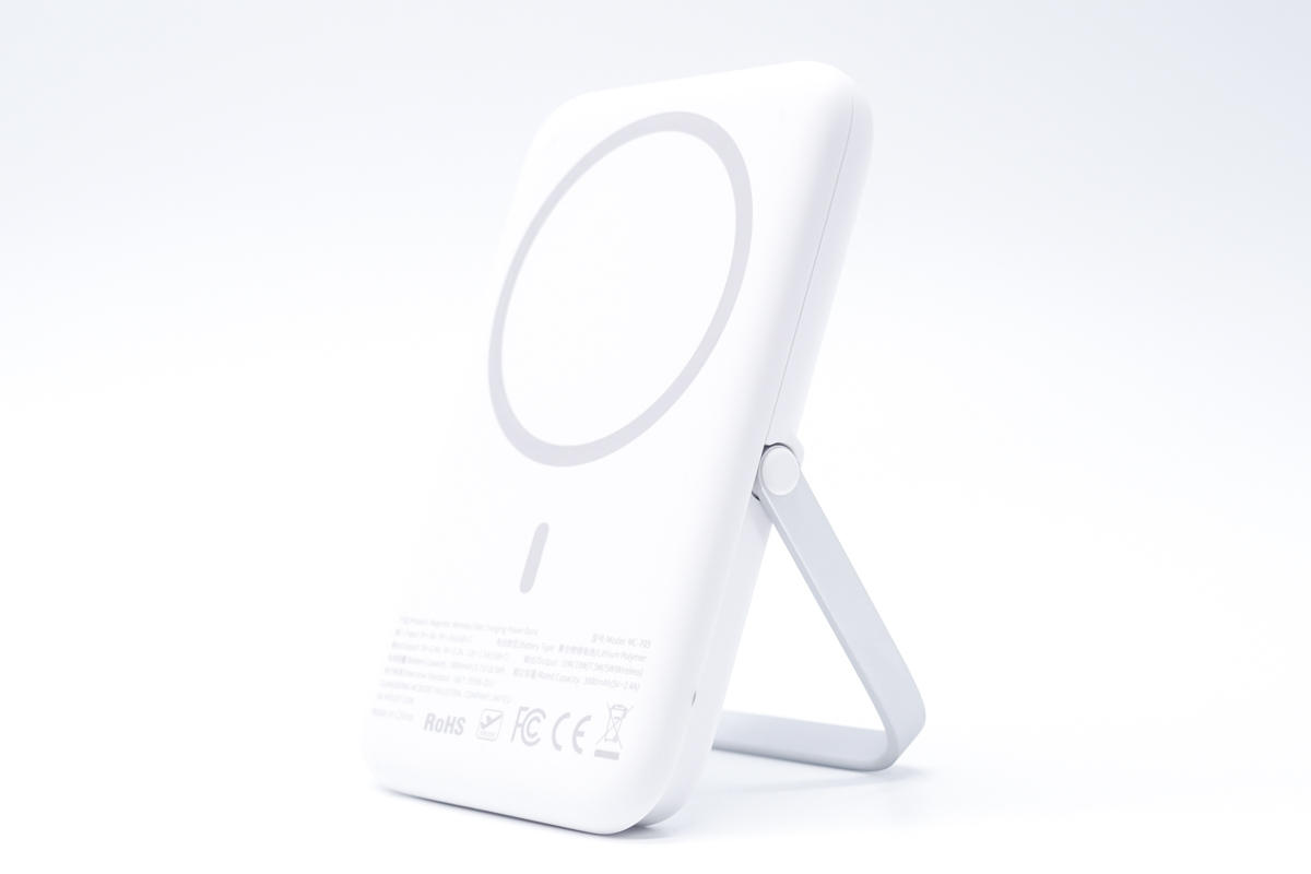 移动电源采用PC材质白色外壳,表面哑光,边角过渡圆润。产品一大特点是设计有可收纳U形支脚,平时不影响外出携带,需要时可展开,整个产品变成无线充支架,方便边充电边看视频。