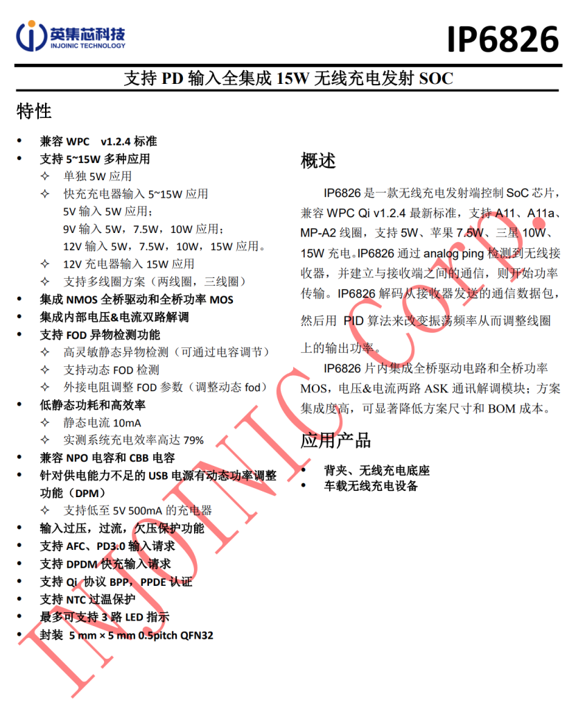 英集芯IP6826采用QFN5*5-32封装,适用于无线充电应用,例如无线充电背夹,无线充电器以及无线车充应用。