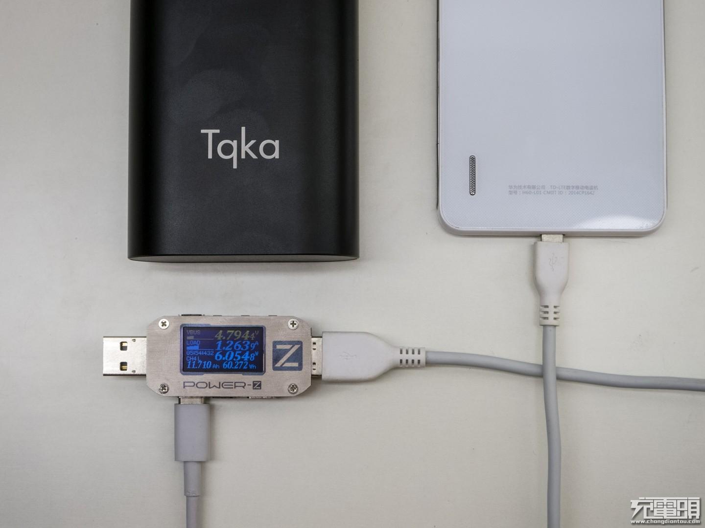 移动电源给荣耀6手机充电,电压4.794V 电流1.26A功率6.05W。