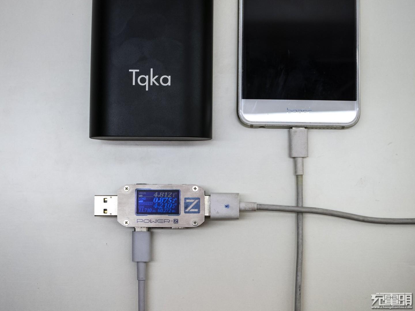 给荣耀8手机充电,电压4.812V 电流0.875A功率4.21W,手机电量较多已经限流了。