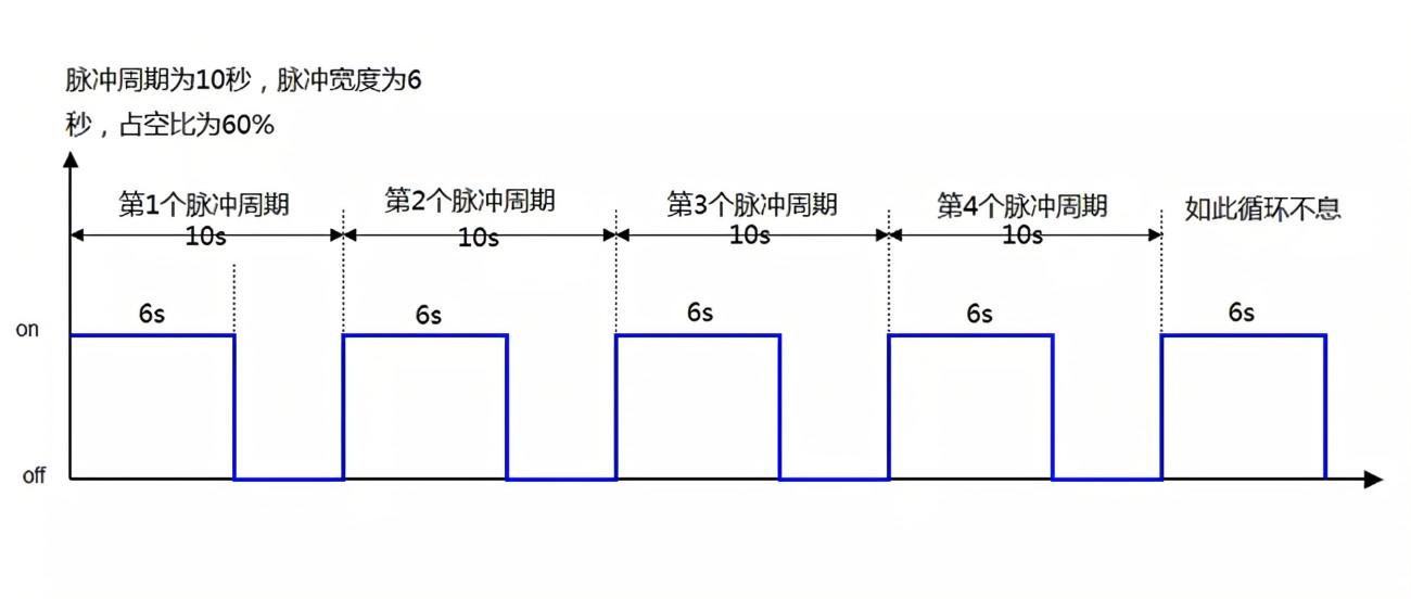 比方说,周期的时间是10s,脉宽时间是6s,那么占空比是6/10= 60%,这就是占空比为60%的脉冲信号。