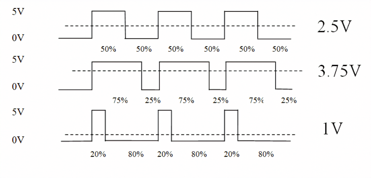 电压是以一种脉冲序列被加到模拟负载上去的,接通时是高电平1,断开时是低电平0。接通时直流供电输出,断开时直流供电断开。通过对接通和断开时间的控制,理论上来讲,可以输出任意不大于最大电压值5V的模拟电压。