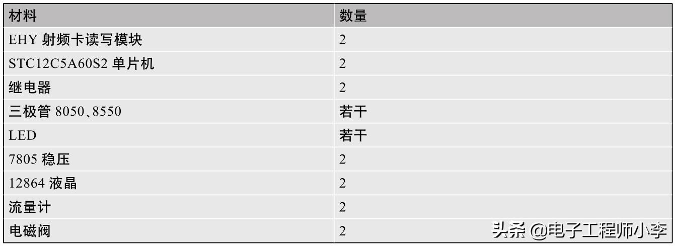 本系统的主控采用STC12C5A60S2单片机,该单片机是增强型51单片机,ROM高达61KB,运算速度是普通51单片机的8倍。STC12C5A60S2兼容51单片机的指令、引脚,而且该单片机具有A/D转换功能、高速低功耗、抗干扰等特点。电磁阀采用12V六分管通水电磁阀,直流持续式工作模式,工作压力在0.02~0.8MPa,介质温度在1~85℃。并且导体与非导体之间应能承受AC2500V电压,1min不击穿以及产生飞弧等现象。流量计采用六分管高精度水流量传感器,频率F=26×Q(Q表示流量,单位为L/min),内径3.0mm,流量范围0.5~5L/min。射频卡采用RFID读卡模块和EHUOYAN IC卡。