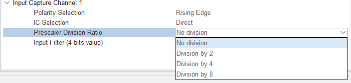 设定捕获的分频系数,可以设定不分频、2分频、4分频、8分频,四种模式。假定设置为2分频,则信号发出两个脉冲,单片机捕获一次,4分频、8分频则依次类推;捕获分频系数设定